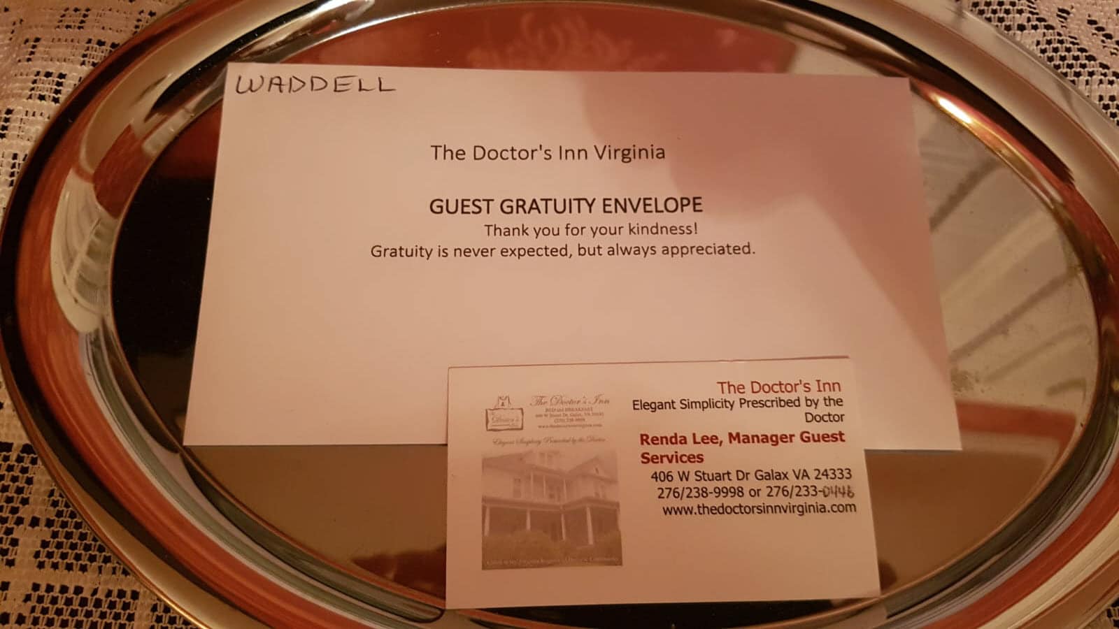 כאשר נכנסו לחדר, שמתי לב למגש כסף קטן שהיה מונח על שידה ובתוכו מעטפה ועליה הכיתוב הבא: