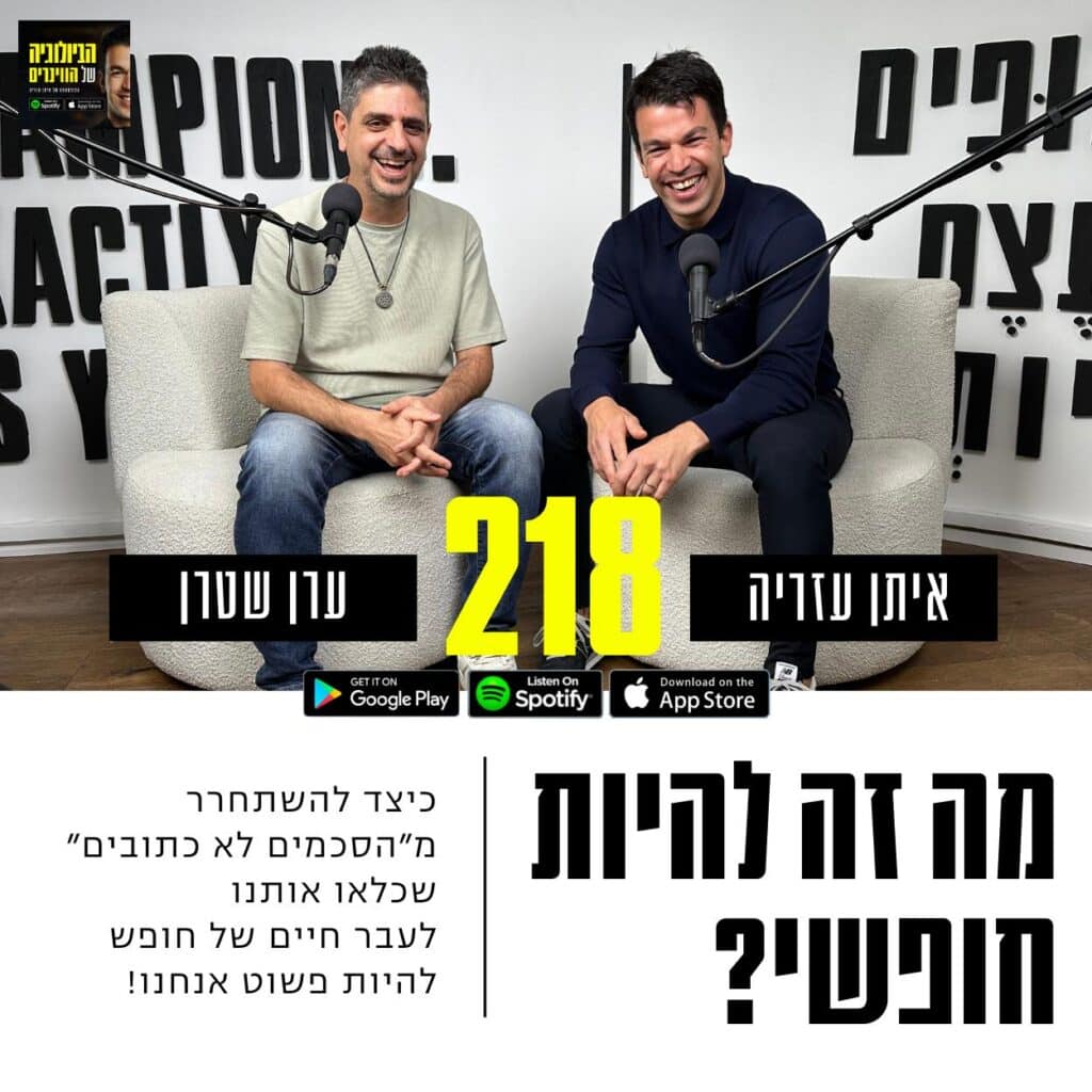 אם ניכנס למהות העמוקה של המילה חופש אנחנו נגלה שלאורך חיינו חתמנו ברמה לא מודעת ״הסכמים לא כתובים״ – שהפכו לאמת שלנו וכלאו אותנו בחיים שלא ממש בחרנו. איך יוצאים מזה? כדי להיות חופשיים באמת עלינו להתמסר לתהליך אמיץ, עם שאלות שמעולם לא שאלנו, שיציפו קול שמזמן לא השמיע את עצמו – הקול האמיתי שלנו. ואין כמו חברי היקר ערן שטרן, לבנות לנו מרחב בטוח בפרק מיוחד שבו נוכל לזהות את הקול הזה. הקול של החופש הפנימי שלנו. פרק עם אדם אמיץ – לווינרים אמיצים כמוכם. האזנה נעימה אהובים.