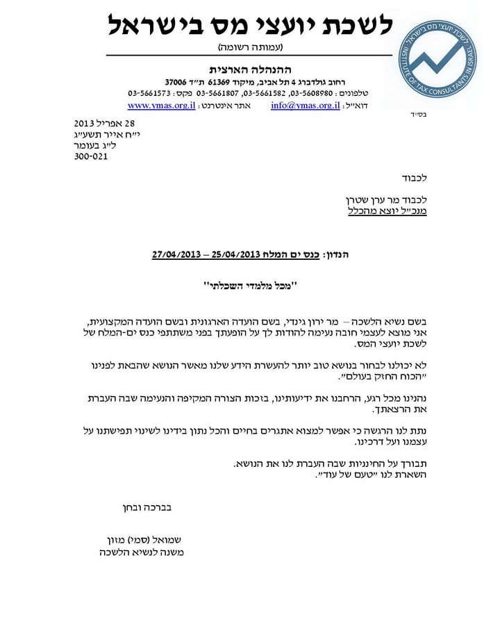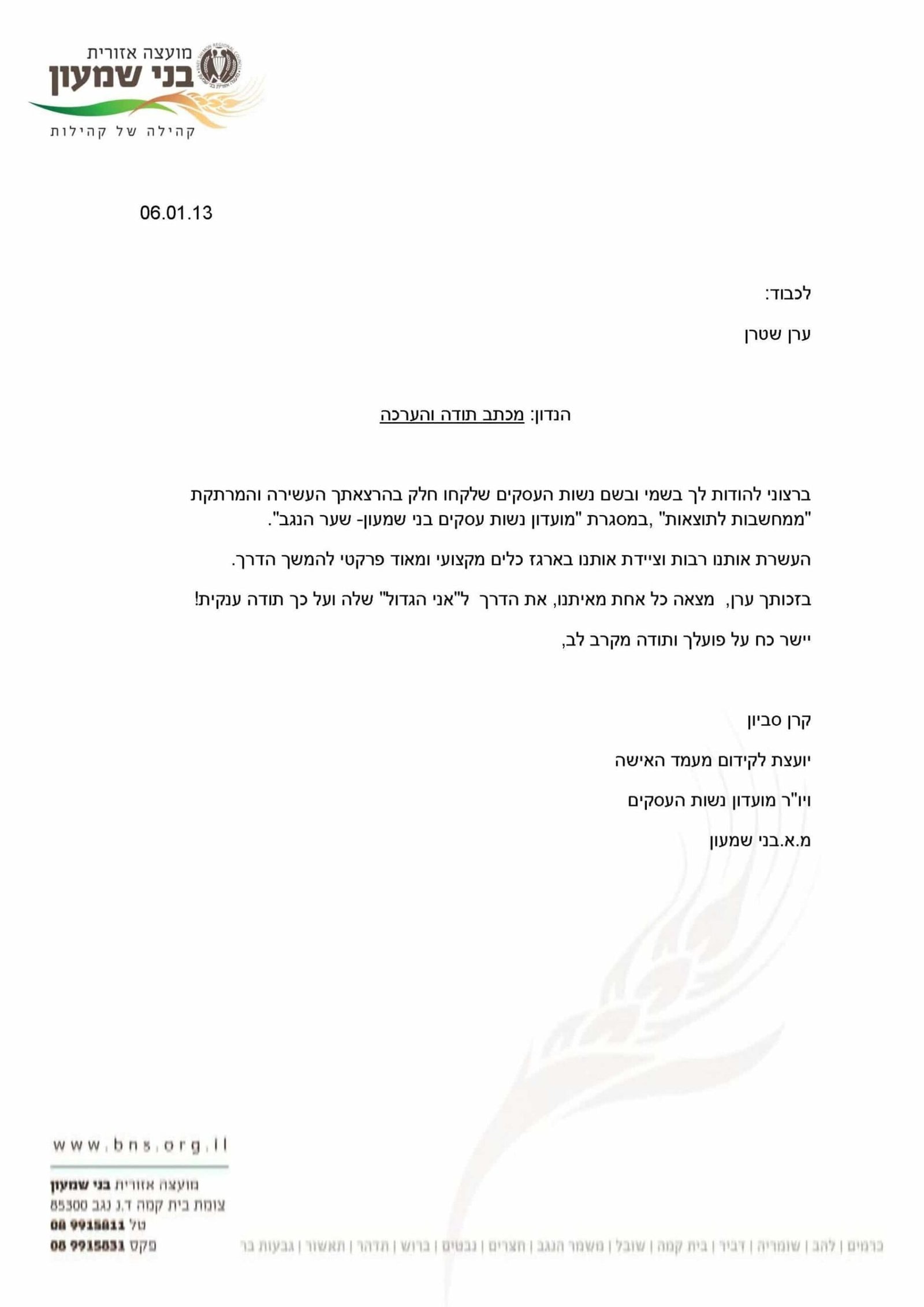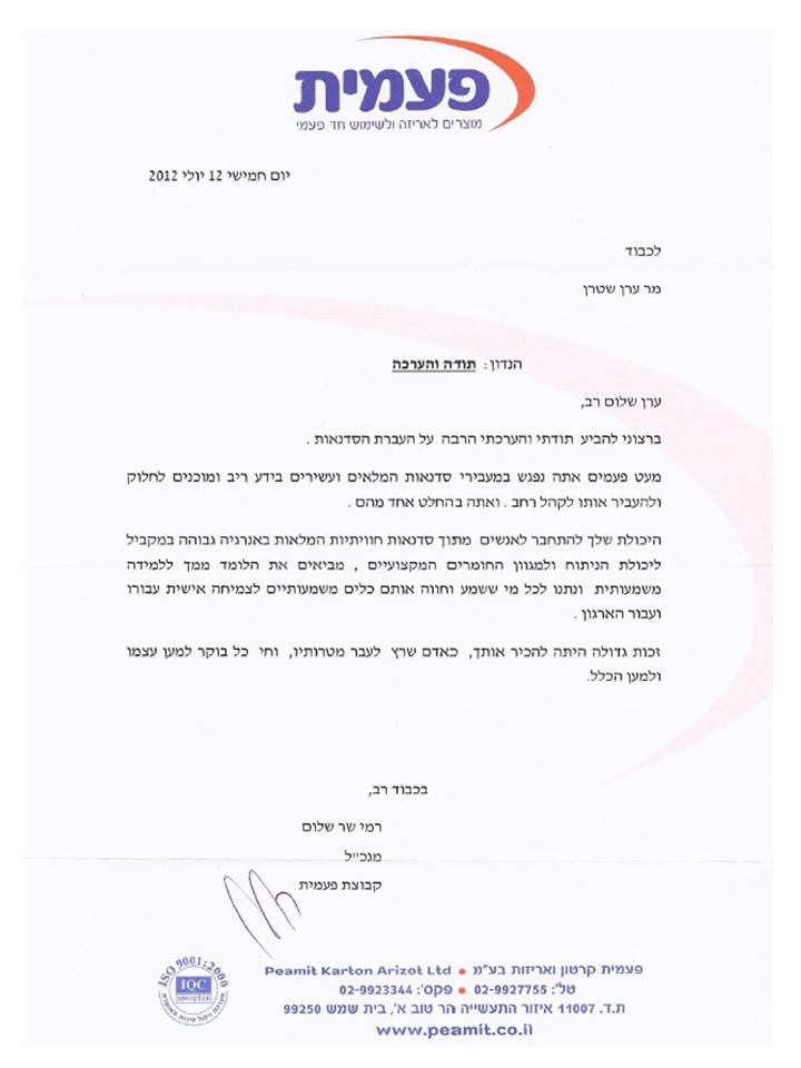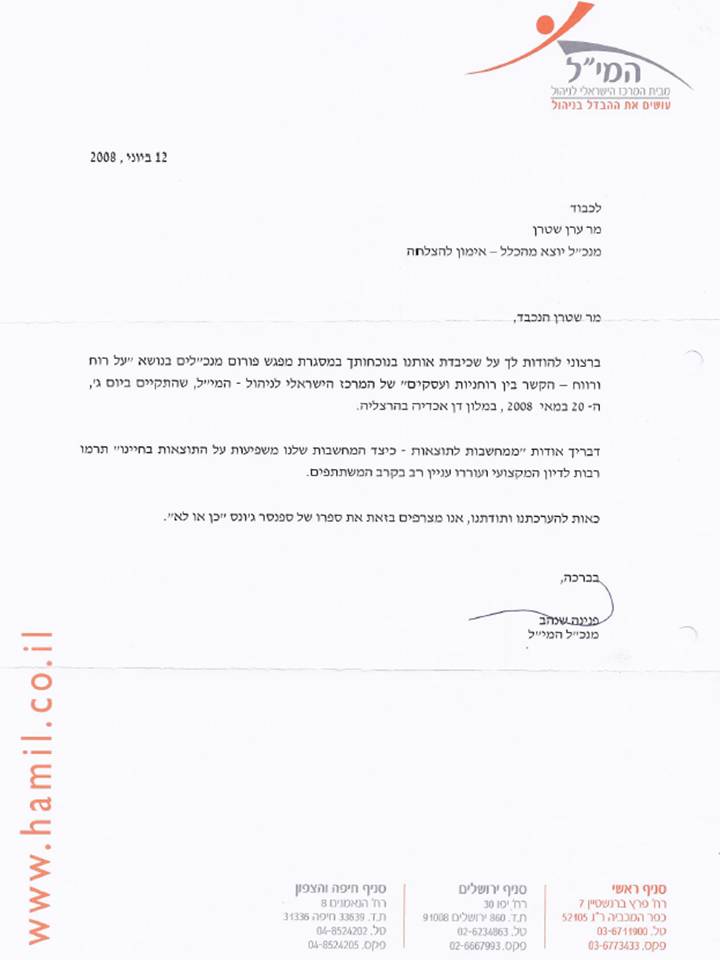 אני מבקש להודות לך מקרב לב, בשם חבריי בהנהלת החברה, על הסדנה המאלפת שהעברת לנו. הצלחת לקחת אותנו למחוזות אחרים שאיננו מודעים להם בעשייה היומיומית ופתחת לנו חלון ענק שממנו רק ניתן להמריא. אני משוכנע כי זאת סנונית ראשונה ואחריה יבואו מפגשים נוספים כי התיאבון שלנו רק התגבר לעוד…