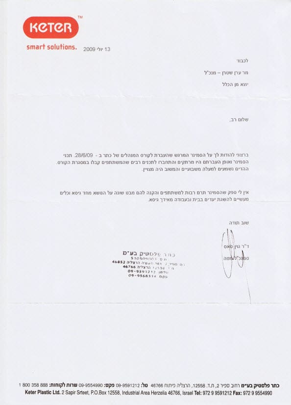 ברצוני להודות לך על הסמינר המרגש שהעברת לקורס המנהלים של כתר. תכני הסמינר ואופן העברתם היו מרתקים, והתחברו לתכנים רבים שהמשתתפים קיבלו במסגרת הקורס. ההדים נשמעים למעלה משבועיים והמשוב היה מצויין. אין לי ספק שהסמינר תרם רבות למשתתפים והקנה להם מבט שונה על הנושא מחד גיסא וכלים מעשיים להשגת יעדים בבית ובעבודה מאידך גיסא.