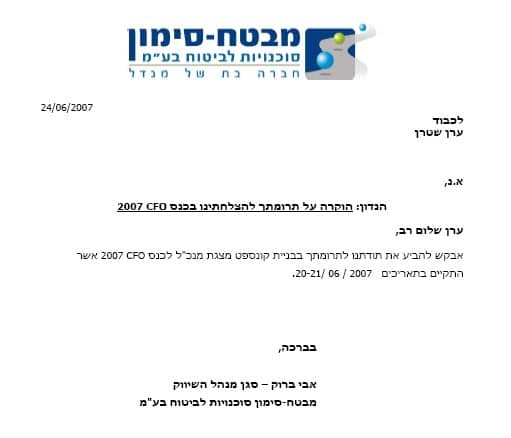 רציתי להודות לך על הכול, ההרצאה הייתה מקסימה, אנשים מאוד מאוד נהנו. איציק המנכ"ל ואני מקבלים תגובות חיוביות מאנשים. זה עשה משהוא לאנשים אין ספק!