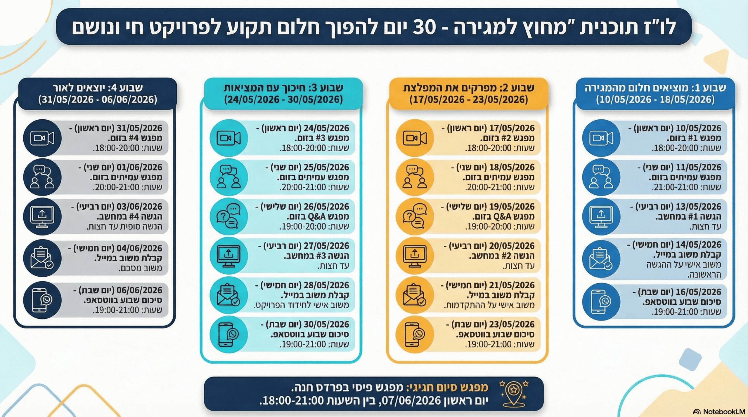 בוחרים חלום, מתרגמים אותו לפרויקט קונקרטי, מגדירים יעד משמעותי, בר השגה ועד סוף התוכנית יוצרים אותו כבר במציאות!