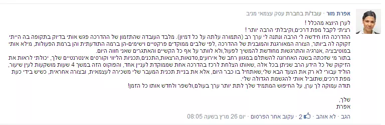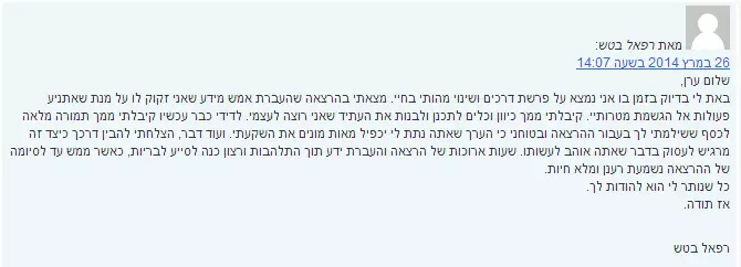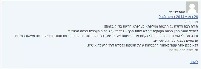 כמורה דרך שלי, כמאמן, שליווה אותי במשך שנה שלמה, בתוך תוכנית אימון מיוחדת במינה, אשר אני מייחסת לה כאחת מנקודות הציון החשובות והמשמעותיות בחיי, אני זוקפת לזכותך, את הגשמת חלומי ואת הגשמת יעודי.